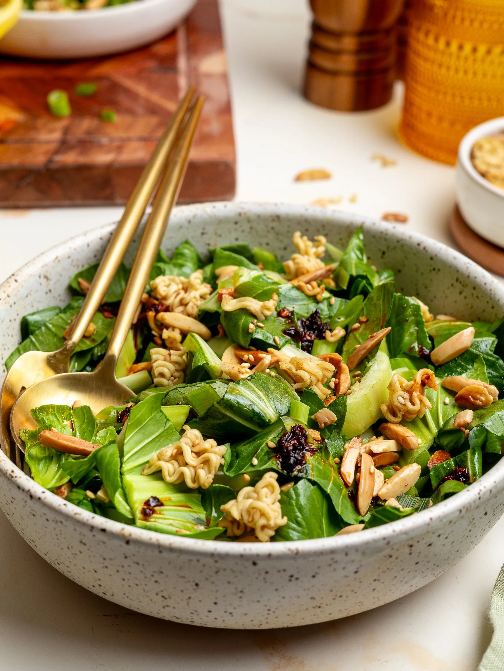 Add the bok choy and scallions to a large bowl. Pour on the dressing and toss to coat. Fold in the toasted almond-ramen mixture just before serving. Top the salad with a sprinkle of sesame seeds and chili crisp if desired.