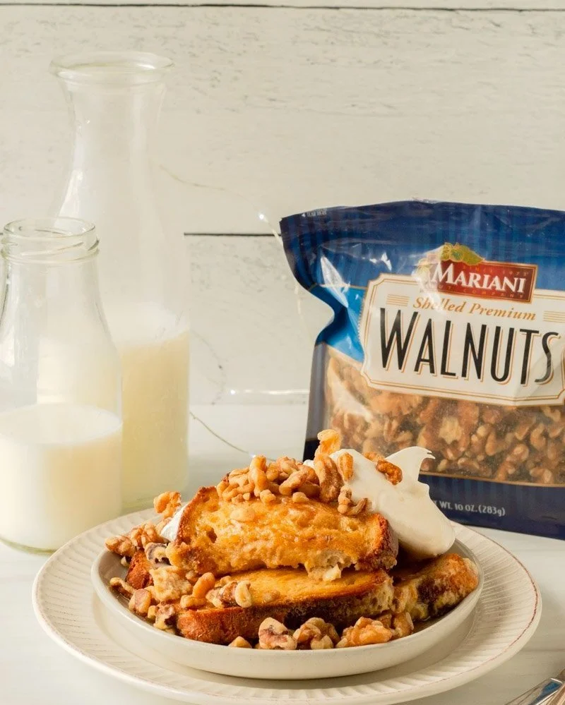 - When the french toast is done, sprinkle with chopped walnuts and pour maple syrup on top. Enjoy!