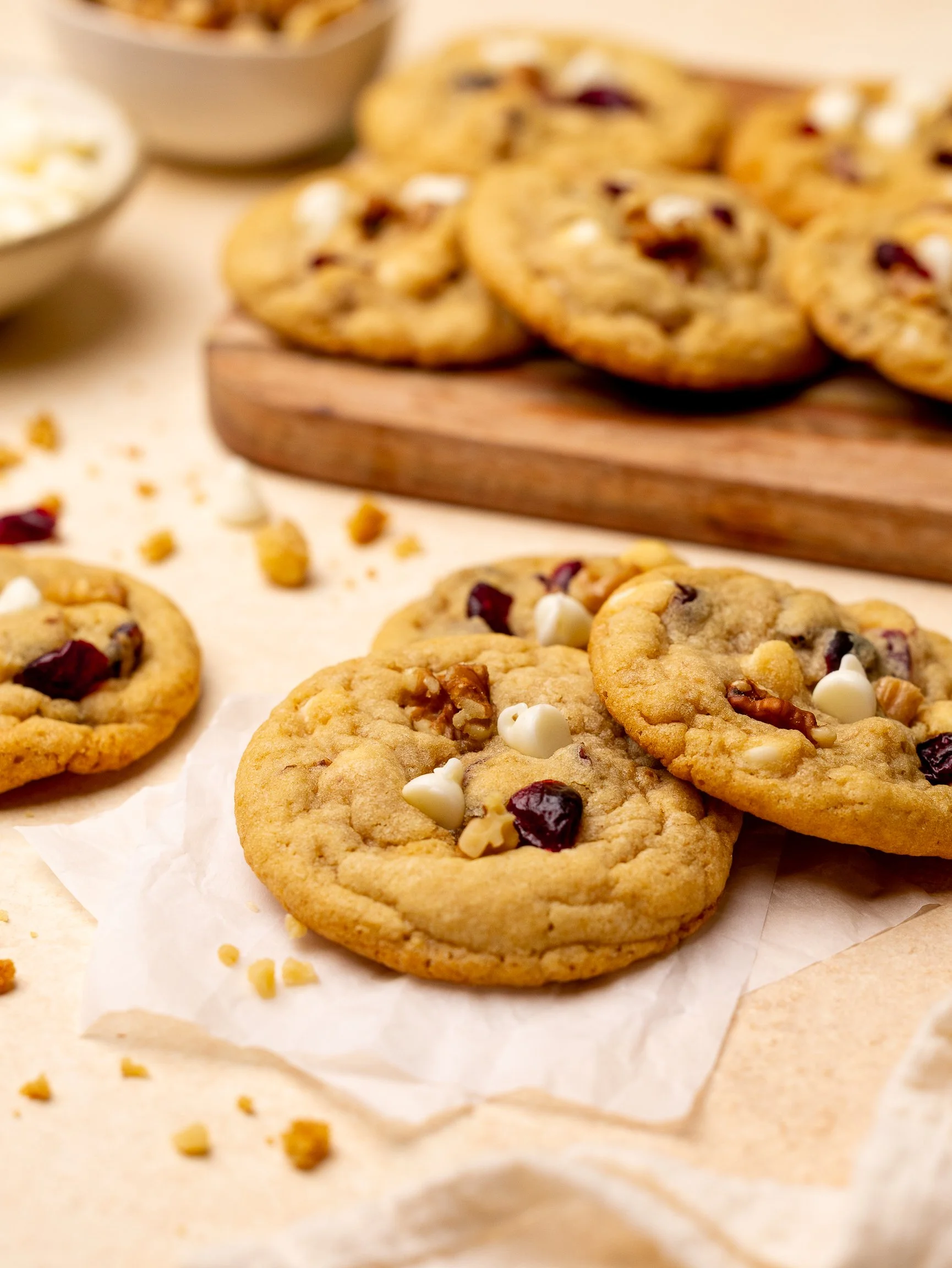 Fold in the white chocolate chips, cranberries, and Mariani walnuts until evenly distributed.